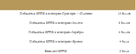 EffieIndex – рейтинг, который популярен во всем мире, его запустили еще в 2011 году. Агентства, которые заняли призовые места, и попали в список кандидатов премии AwardsRussia, могут попасть в данный рейтинг. Каждая компания получает баллы, которые влияют на место в рейтинге.